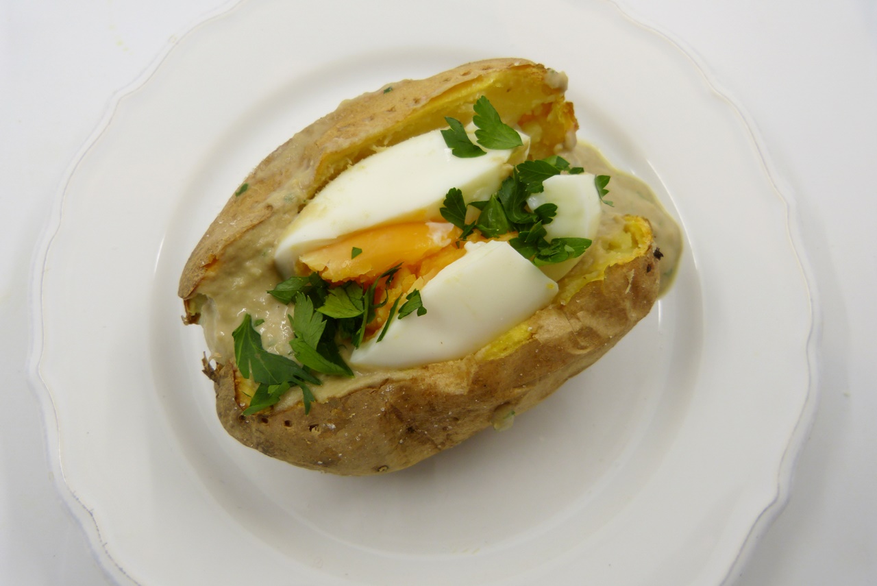 Zum Servieren die Kartoffeln fast halbieren, sie sollen unten noch zusammenhalten. Von außen etwas etwas drücken, damit das Fruchtfleisch etwas lockerer wird. Das Innere mit etwas Salz würzen. Etwas Sauce in jede Kartoffel geben, dann ein Ei hinsetzen. Die Eier anschneiden, damit das Eigelb in die Sauce läuft. Salzen, mit der restlichen Petersilie bestreuen und gleich servieren.