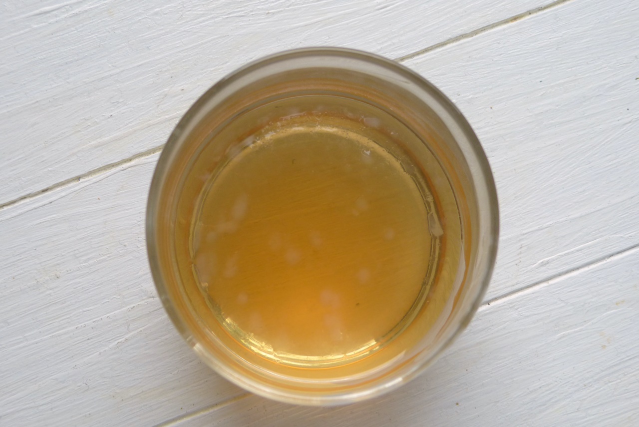 Man vermengt schlicht etwas Kombucha mit ein wenig Zucker und lässt das Ganze stehen. Wenn man wirklich einen nicht pasteurisierten Kombucha hat, bildet sich nach wenigen Tagen ein frischer SCOBY; oben seht Ihr kleine Punkte auf der Oberfläche, das ist der Anfang.