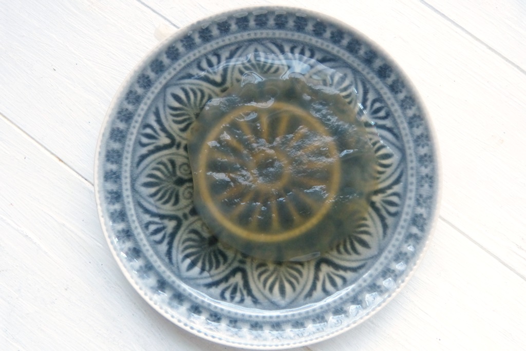 Fertig ist der Pilz, wenn der Tee säuerlich schmeckt und ein wenig Kohlensäure entwickelt hat. Dann habt Ihr auf der Oberfläche eine gallertartige Schicht, die schon einige Millimeter dick ist. Das ist der gebrauchsfertige SCOBY, mit dessen Hilfe Ihr nun „richtigen“ Kombucha herstellen könnt. Ich habe zunächst mit einem halben Liter begonnen; aber der SCOBY wächst rasch und Ihr könnt immer mehr Kombucha brauen.