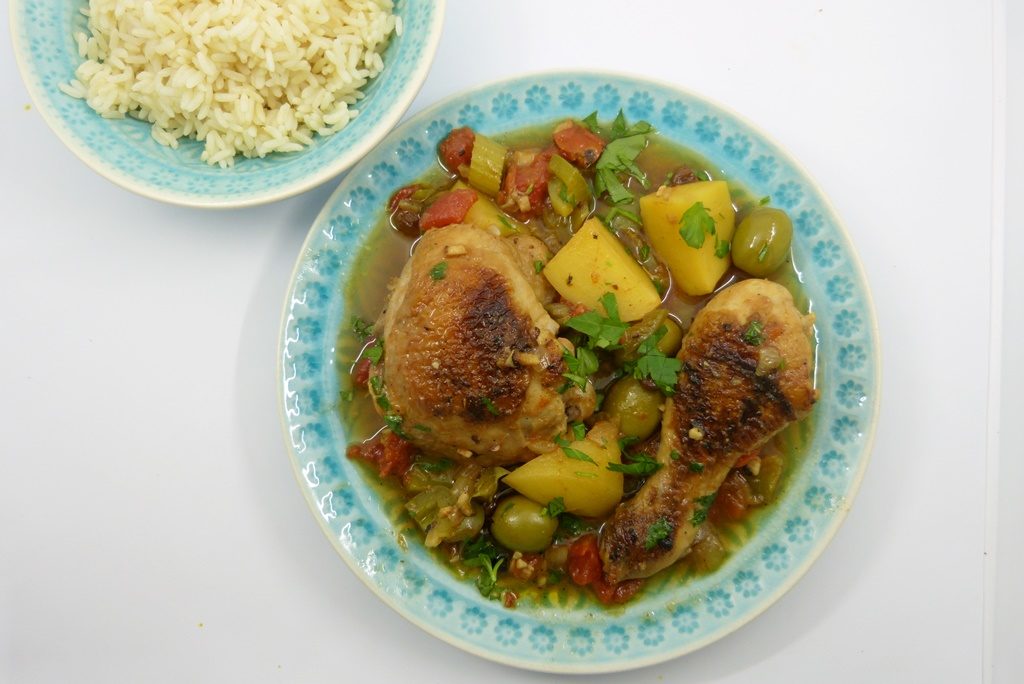 Unter den kubanischen Rezepten, die da vorgeschlagen wurden, hat mich dieses hier am meisten angesprochen. „Fricasé“, das ist auf Kuba die Bezeichnung für Eintopfgerichte mit Fleisch, Gemüse und Kartoffeln, die in einer knoblauchlastigen Tomatensauce gegart werden. Der spanische Einfluß spiegelt sich in den verwendeten Kapern, Oliven und Rosinen wider.