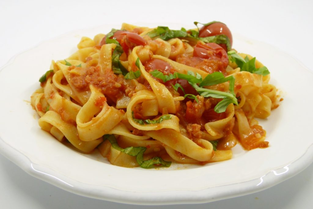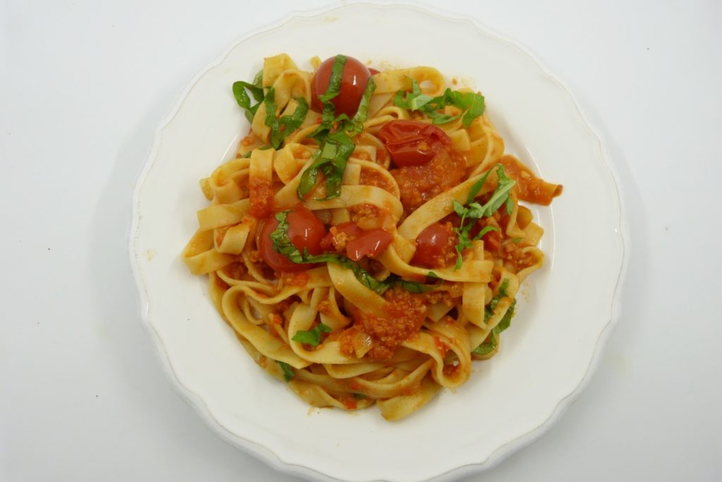 Sauce mit Pasta nach Wahl servieren; wer mag, gibt noch Parmesan dazu.
