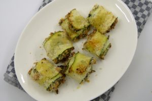 Zucchini gab es auch noch; aus denen habe ich Involtini gemacht. Die Streifen werden gefüllt mit den Zucchiniabschnitten, Pinienkernen, Bröseln und Ei, anschließend werden die Röllchen in Semmelbröseln gewendet und gebacken. In der Art gibt es das im Sommer bestimmt noch öfter.