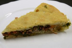 Gut, das war viel Gemüse. Zum Ausgleich gibt es jetzt noch Krakenpastete – Claudio nennt sie „Krasse Krakenpastete„, das kommt hin, sie ist genial. Pizzateig, gefüllt, mit gegartem Oktopus, Petersilie und Oliven.