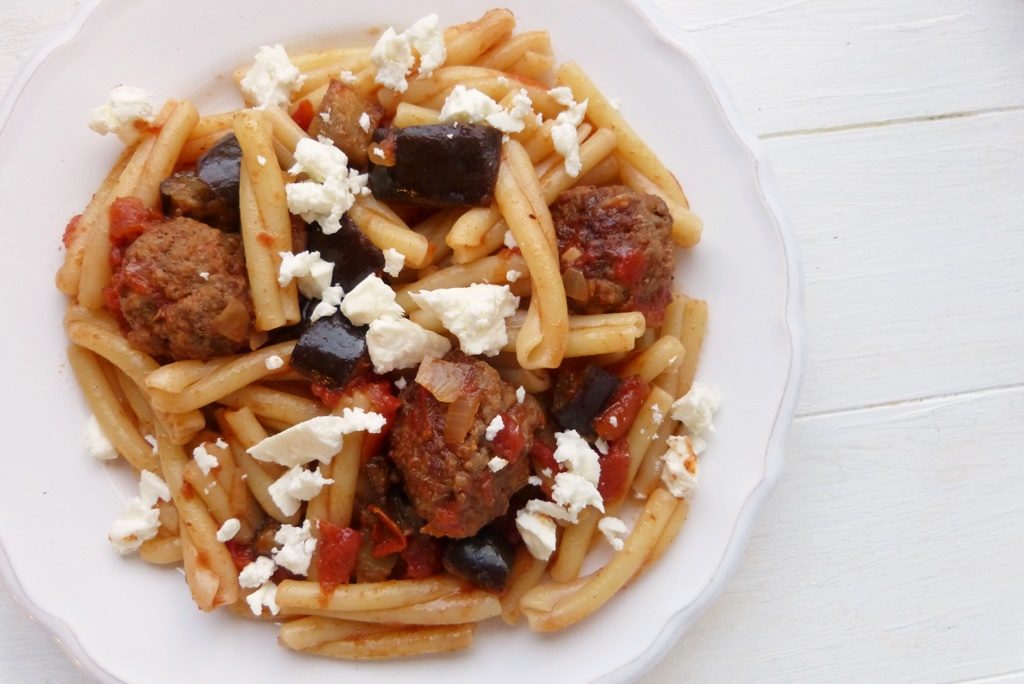 Ich bin ja die, die am liebsten zu allem Gemüse hat. So kommt uns dieses Gericht allen entgegen, denn die Aubergine fügt sich ganz brav ein. Das „Moussaka“ in Rezepttitel ist auch der Aubergine zu verdanken – zusammen mit Kreuzkümmel, Zimt und Oregano, die für Würze sorgen. Der Geschmack von Moussaka auf einem Teller Nudeln….