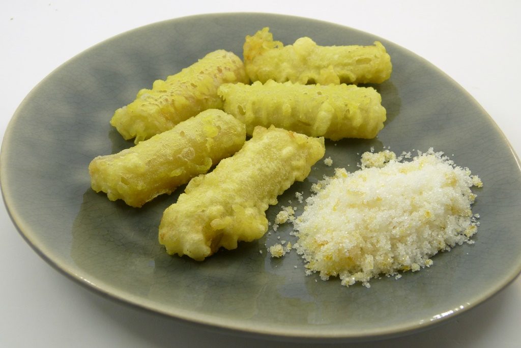 Das Buch stelle ich Euch später noch genauer vor; da lohnt sich jede Zeile. Jetzt erst mal zum Rhabarber: der bekommt eine Hülle aus Ausbackteig, wird dann fix frittiert und zum Essen in Zitronenzucker getunkt – sehr einfach, und die Kombination zwischen dem heißen, säuerlichen und knusprigen Rhabarber und dem zitronigen Zucker ist schlicht himmlisch.
