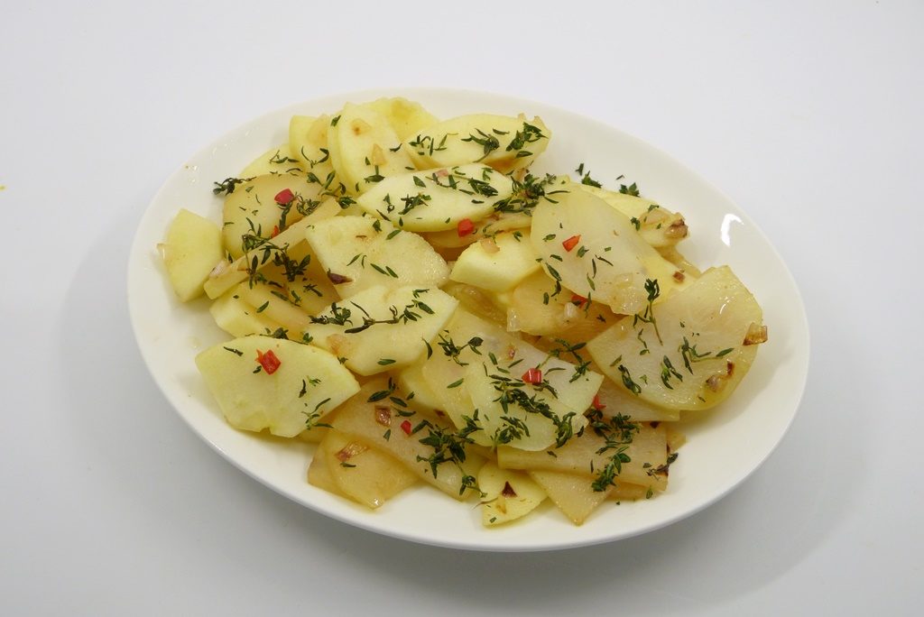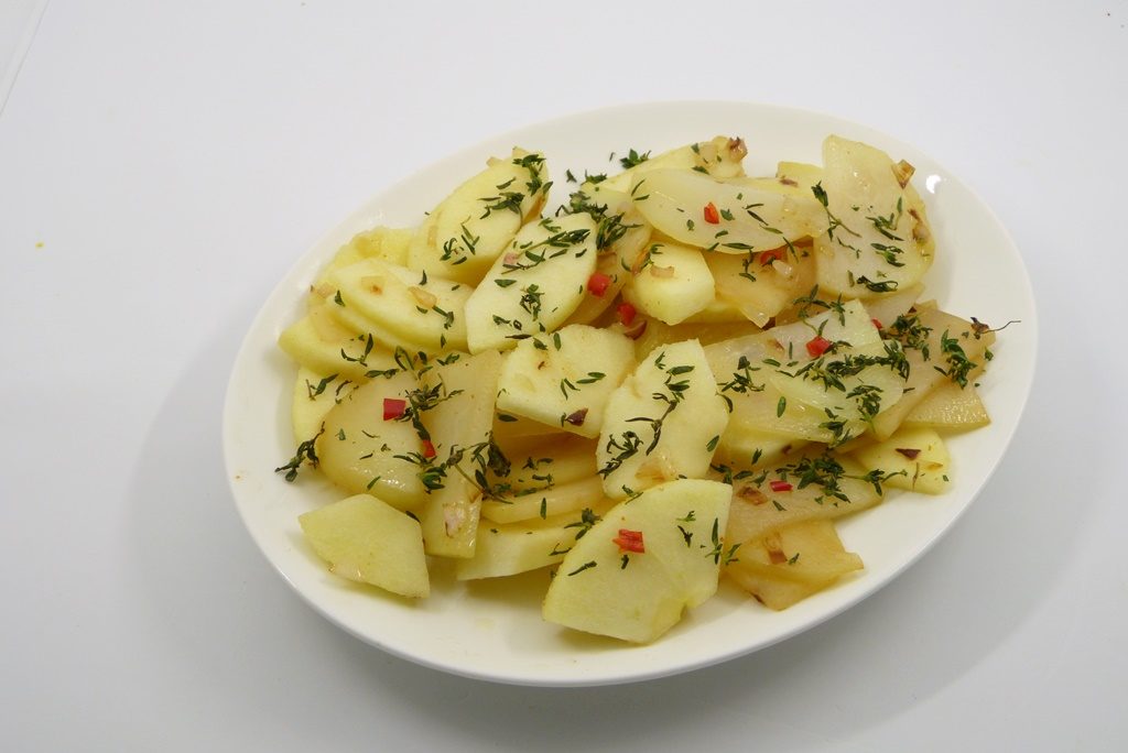 Marias Salat läßt aber noch Platz für andere Köstlichkeiten – der Kohlrabi wird in Scheiben geschnitten, mariniert und gegart. Dazu gesellen sich dann Äpfel und etwas Chili und im Original auch stattliche 50 (!) Gramm gehackte Thymian-Blättchen. Davon habe ich Abstand genommen.