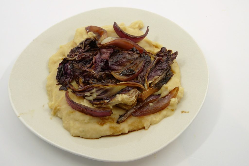 Radicchio und Zwiebeln auf dem Bohnenpüree verteilen, mit Salz und Pfeffer würzen und servieren.