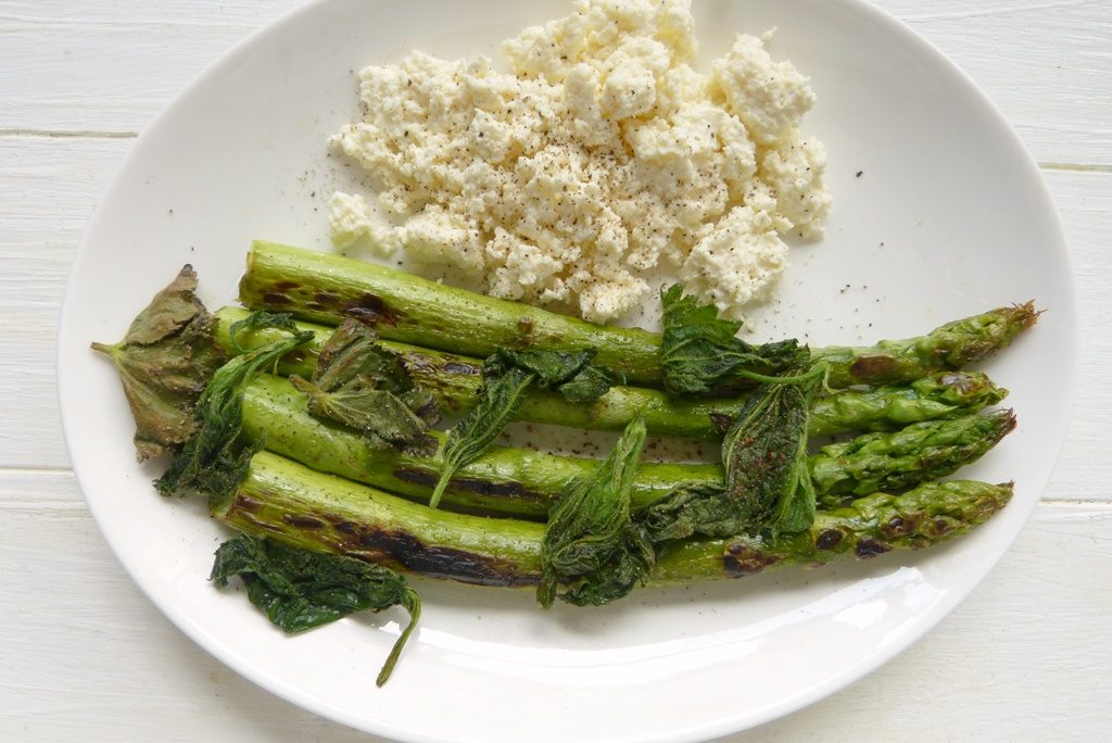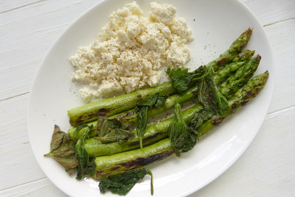 Im Original wird der Spargel in einer Pfanne über dem Feuer gebraten – aber wenn man ordentlich Hitze gibt, dann geht das gut auch auf dem Herd. Die Brennnesseln werden kurz mitgebraten, im Original kommen an Kräutern Sauerklee und Buchenblätter hinzu. Ich habe im Garten gewütet und statt dessen die ominösen Frauenmantelblätter verwendet.