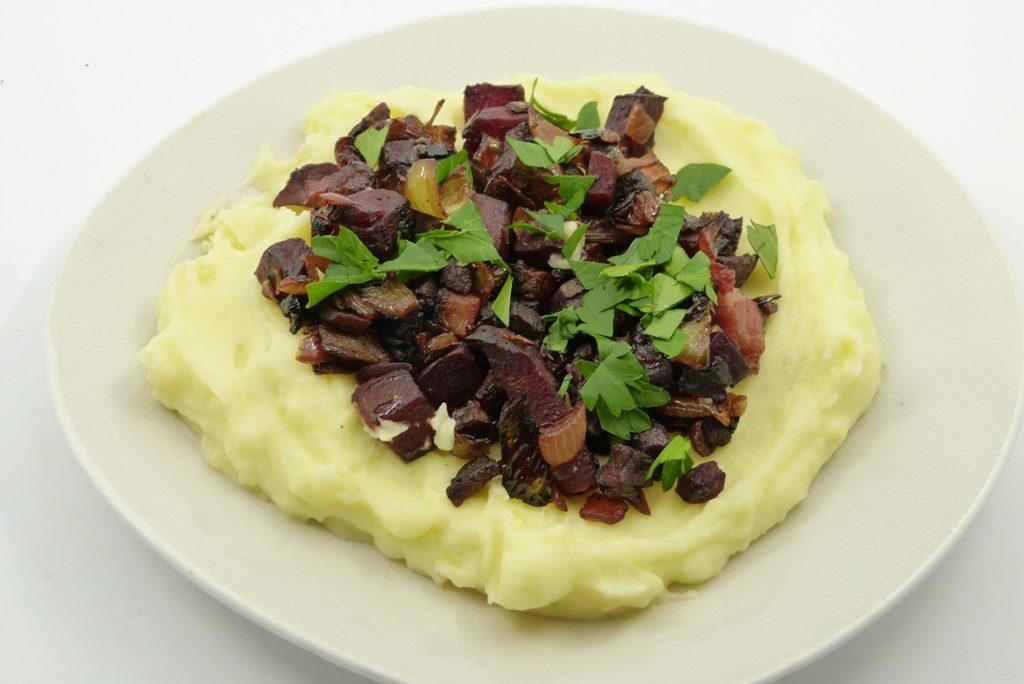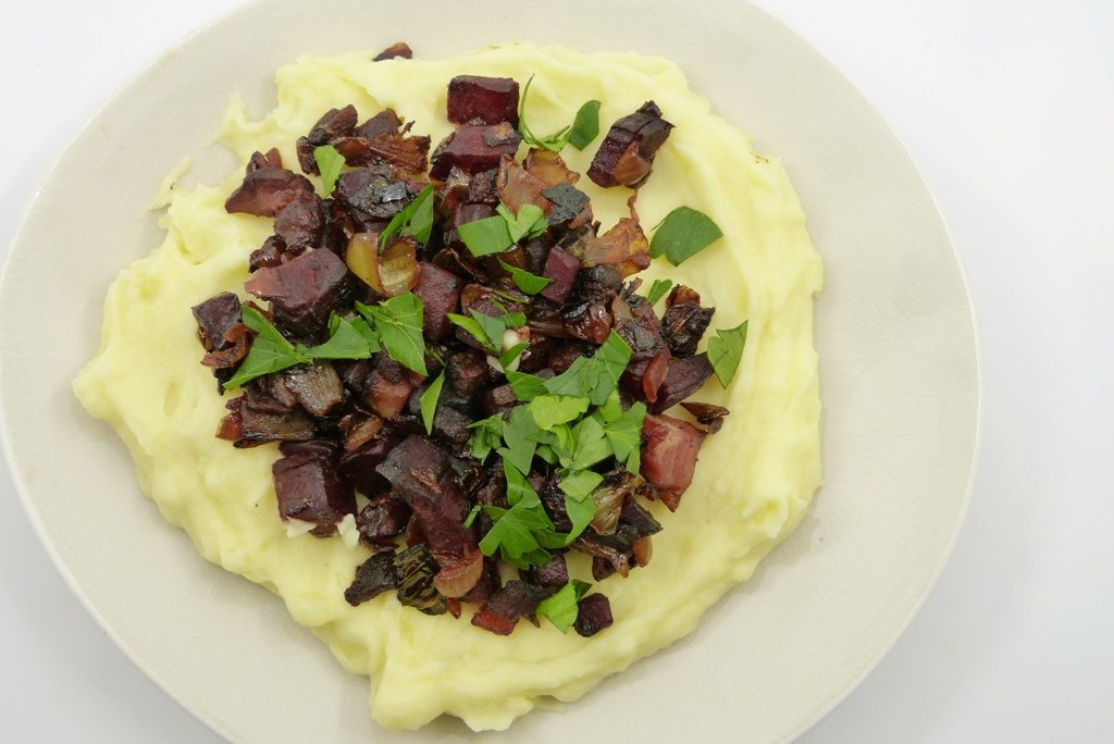 Das ist doch mal ein schöner Anlass. Und das Essen steht auch wirklich schnell auf dem Tisch, denn in der Zeit, in der die Kartoffeln garen, kann man schon mal die Toppings herrichten. Klassischerweise gäbe es noch Rote Bete dazu. Ich stelle Euch hier die Version von Trine Hahnemann* vor – da wandert die Rote Bete gleich mit ins Topping. Geht noch schneller, möchte man sagen, aber das ist egal – jedenfalls schmeckt das herrlich. Rote Bete, Zwiebeln und Speck, die lieben sich eben.