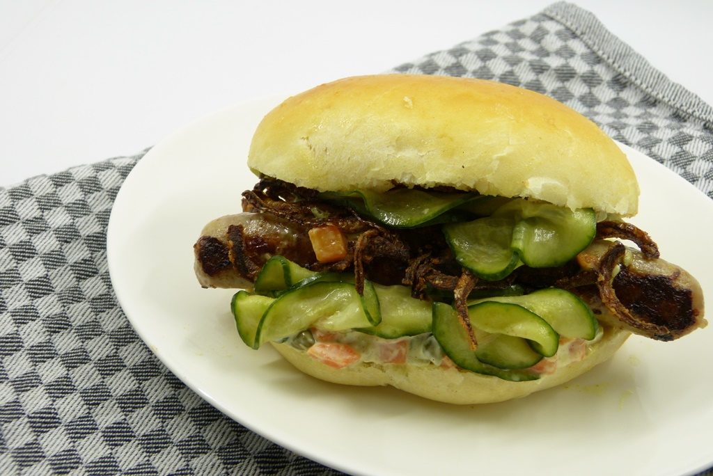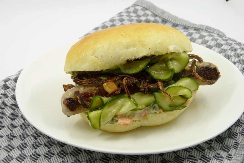 Es dauert ein wenig, bis die Hotdogs auf dem Tisch stehen, denn sie haben ein paar Komponenten mehr: man bäckt die Brötchen, frittiert Röstzwiebeln, macht Gurkensalat und Remoulade. Der Aufwand lohnt sich – die Hotdogs sind toll. Die Brötchen sind wunderbar fluffig und soft; die haben mir so gut gefallen, dass das in Zukunft mein Standard-Rezept für Burger-Buns sein wird. Ich bin nicht alleine damit – hier besteht hohe Nachfrage nach den Buns…