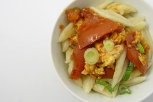 Mian sind chinesische handgemachte Nudeln. Der Teig besteht schlicht aus Weizenmehl, Wasser und Salz. Am bekanntesten sind wohl die handgezogenen la mian – es hat etwas von einer Lebensaufgabe, diese Technik zu meistern. miss boulette hat da mal was ausprobiert… Im Buch gibt es eine abgekürzte Technik, und es gibt anders geformte Varianten. Zum Beispiel diese geschnippelten mian. Dafür werden vom Teig einfach mit der Schere kleine Stückchen abgeschnitten. Das ergibt eine spannende Form, macht Spaß und schmeckt toll. Dazu gibt es Tomate und Rührei – einfach und gut.