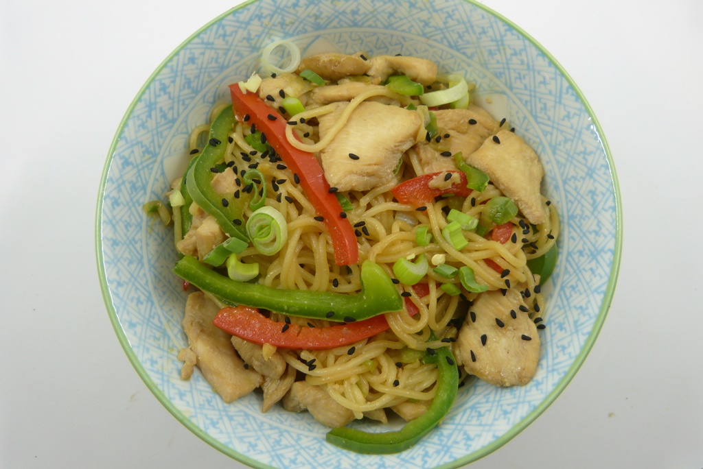 Nochmals chinesische Nudeln – diesmal in der dünnen, langen Form, die es überall zu kaufen gibt. Bei mir kamen die Nudeln aus dem Pasta-Maker. Es sind gebratene Nudeln, wieder ganz schlicht und gut mit in Sojasauce mariniertem Huhn, Paprika, Ingwer und Frühlingszwiebeln.