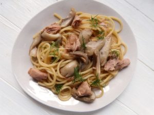 In Japan hat man ja westliche Gerichte auf eine ganz eigene Art interpretiert und so gibt es da auch Spaghetti – aber eben auf japanische Art. Mit Thunfisch, Pilzen und Sojasauce.