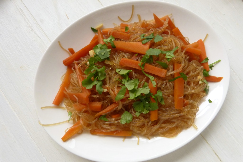 Für die Fensi mit Karotten werden zuvor eingeweichte Glasnudeln mit Karotten und Sojasauce gegart. Ich habe zusätzlich noch eine beachtliche Menge Flüssigkeit zusätzlich in den Wok gegeben, trotzdem war alles leider sehr trocken.