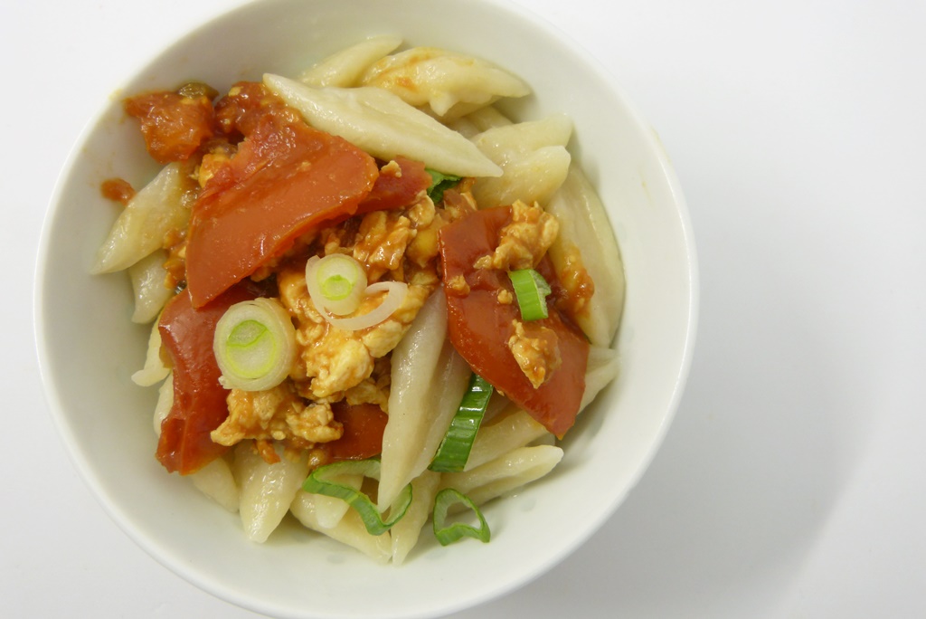 Als Sauce oder Topping gibt es Rührei mit Tomaten – ein chinesischer Küchenklassiker, den ich hier schon einmal vorgestellt habe.