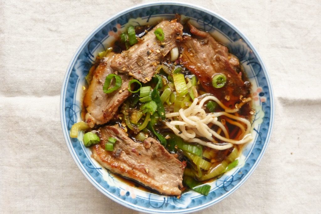 Wie auch immer es um den Namen bestellt ist – die Suppe ist toll. Das liegt zum größten Teil an der Brühe: Ente, Lauch und Soba liegen in Tsuyu, das ist eine Mischung aus der bekannten Dashi mit einem Anteil an Kaeshi, einer Würzung aus Sojasauce, Mirin und Zucker. Das gibt einen tiefen, süß-salzigen Geschmack. Und Ente, Lauch und erdige Soba tun ihr Übriges.