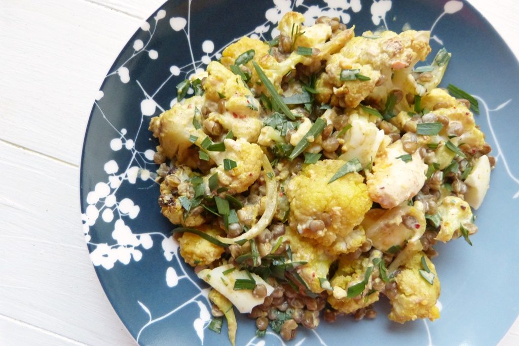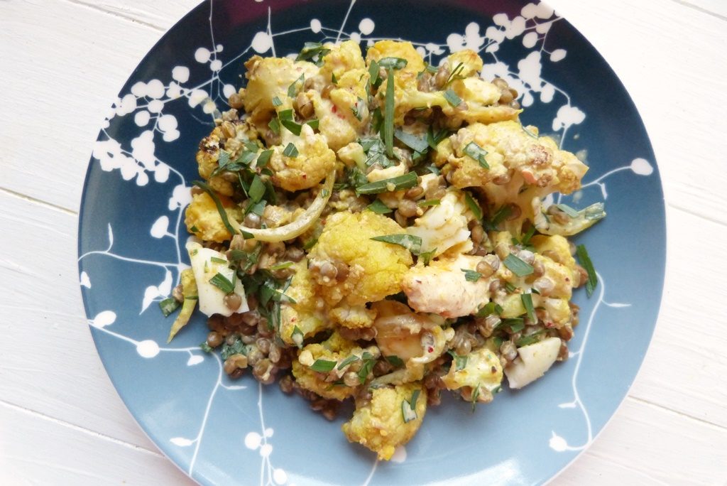 Gut, dieser Salat stammt im Prinzip aus der Feder von Yotam Ottolenghi; allerdings mit Einschränkungen. Ottolenghi knüpft an das in den 1950er Jahren in Großbritannien sehr beliebte Coronation Chicken – ein Geflügelsalat mit Curry-Mayonnaise. Bei im wird daraus ein Eiersalat aus ofengeröstetem Blumenkohl; die Mayonnaise wird mit Joghurt verschlankt. Ich habe einen Teil der Eier ( er nimmt insgesamt neun) durch Linsen ersetzt. Keine schlechte Entscheidung; so hat man noch eine zusätzliche Konsistenz. Ein weiterer Grund für diesen Salat – man braucht Estragon, und der versucht gerade, in meinem Kräutertopf die Weltherrschaft zu übernehmen und muss dringend in seine Schranken verwiesen werden…