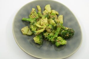 Zum Tofu gab es Brokkoli. Der wird kurz gedämpft und bekommt dann ein Dressing aus körnigem Senf, Sojasauce und Tahin. Senf und Brokkoli vertragen sich sehr gut.