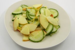 Malte Härtig nennt dieses Gericht Gurken-Apfel-Kimchi; es erinnert an japanische, rasch eingelegte Tsukemono: Gurke, Apfel, etwas Reisessig, Zitronenschale und für den Kick frisch geriebener Meerrettich. Knackig, erfrischend und mit dem gewissen Etwas.