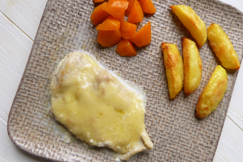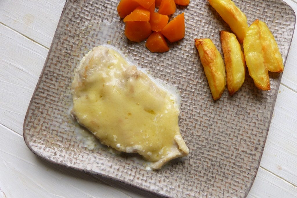 Das ist ein einfaches Gericht, das immer wieder gut ankommt: Hühnchenbrust wird geteilt und geklopft, dann nur kurz in der Pfanne gebraten, anschließend in Milch fertig gegart und mit etwas Käse belegt. Ich habe Kartoffelwedges aus dem Ofen dazu serviert und glasierte Karotten. Ich könnte mir aber auch Kartoffelpüree vorstellen, etwas sautierten Brokkoli….