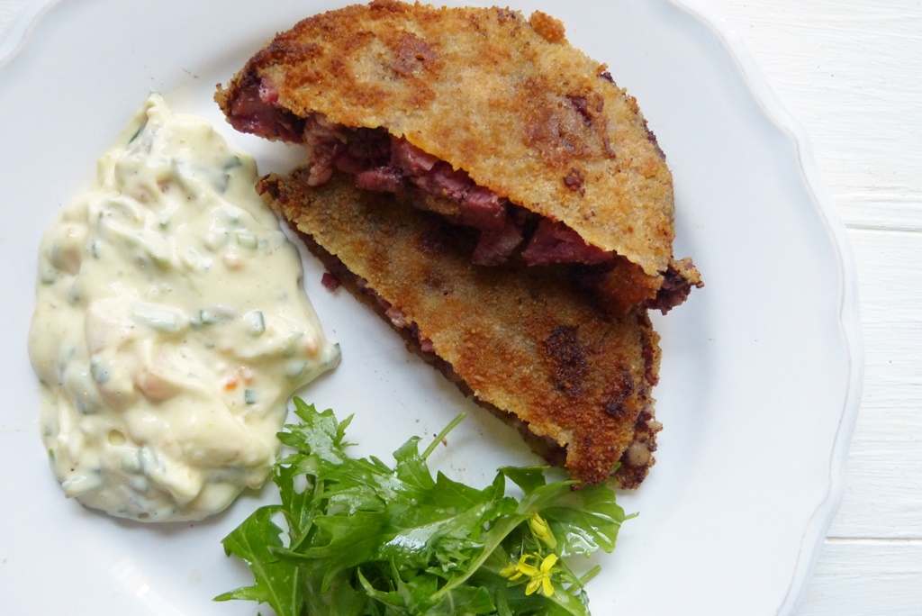 Dank Hans Jörg Bachmeier* hat sich das nun geändert. Hier werden dicke Scheiben Pressack paniert und gebraten – man hat also eine knusprige Hülle. Und in der Hülle verändert sich der Pressack, der feine, mit Blut gebundene Teil wird nämlich weich und cremig. Das ist toll – ich mag jetzt Pressack ;-). Dazu gibt es eine Remouladensauce, selbstgemacht und mit schön viel Einlage.