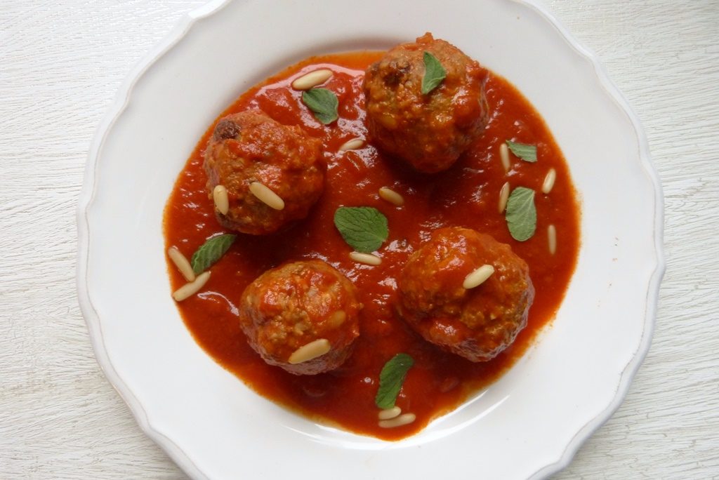 Hackfleisch mit eingeweichten Brotkrumen, Mandelmischung, Käse, Rosinen, Pinienkernen, Zimt und Eiern vermengen und mit Salz, Pfeffer und Peperoncinoflocken abschmecken. Aus der Masse tischtennisballgroße Bällchen formen und diese in heißem Öl rundherum goldbraun anbraten. Die Bällchen dann in die Tomatensauce geben und alles zusammen nochmals 20 min köcheln lassen.