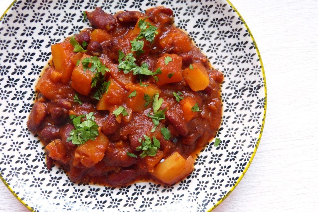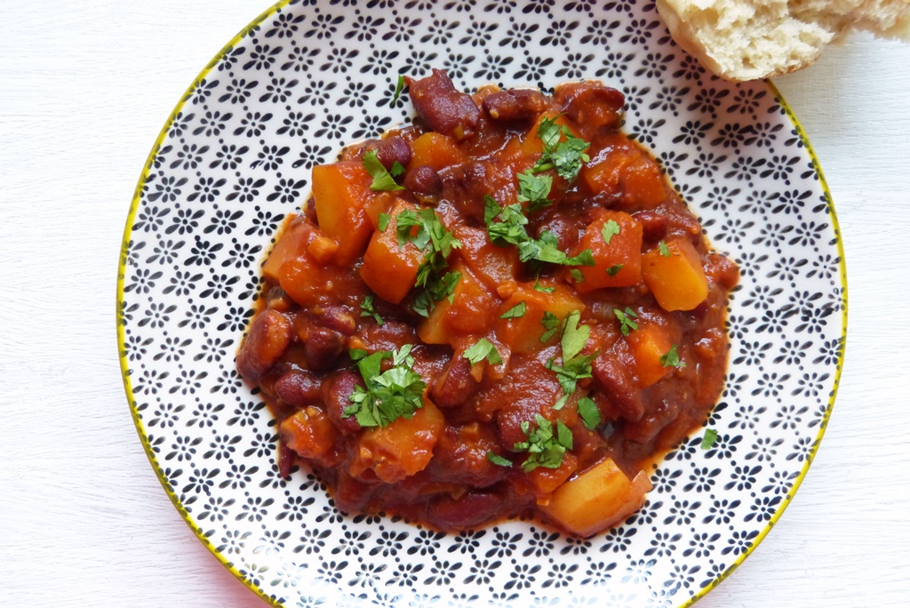 Diese Variante hier kommt von Mauritius und ist zufällig vegan. Bohnen und Gemüse werden in einer mit Chili gewürzten Tomatensauce gegart. Das ist ein leichtes, gemüsiges Essen, das nach Thymian und Zimt duftet. Die verwendeten Kartoffeln dicken die Sauce etwas an und der milde Kürbis gleicht die Chili-Schärfe aus.