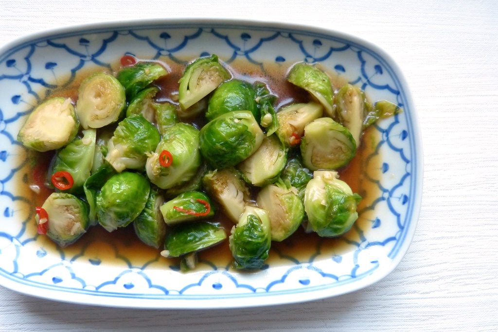 Der Rosenkohl wird kurz bissfest blanchiert, dann mit Knoblauch und Chilis pfannengerührt und mit einer Sauce aus Austernsauce, Fischsauce und thailändischer Sojasauce serviert. Die Röschen haben einen angenehmen Biss, schmecken etwas rauchig, leicht scharf und salzig-süß.