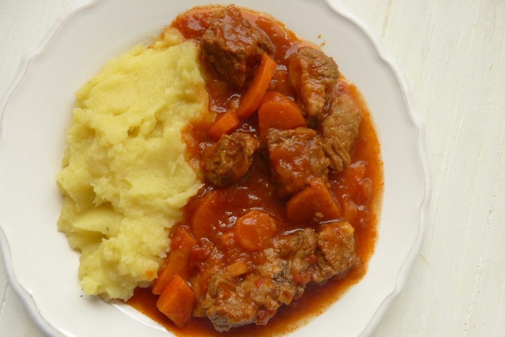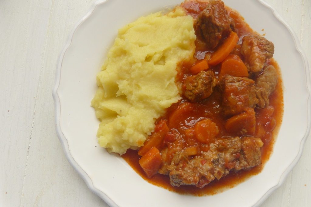 Es ist also ein sehr einfaches Gericht – und durch die lange Schmorzeit mehr als „nur“ die Summe seiner Zutaten. Das Ragout schmort von alleine, und nach ca. 2 Stunden hat man butterweiches Fleisch und eine sämige Sauce. Kartoffelpüree passt sehr gut dazu.
