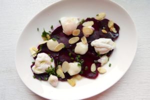 Für das Rote Bete-Carpaccio werden rote Bete in einem würzigen, leicht süß abgeschmeckten Essig-Sud gegart. In diesem Sud dürfen sie einige Tage durchziehen, bevor sie geschält und in Scheiben geschnitten werden. Ausgarniert wird das Carpaccio mit etwas Ziegenkäse, pochierten Wachteleiern, gerösteten Mandelblättchen, Schnittlauch und Limonenöl. Die gegarte Bete kann man gut im Kühlschrank vorhalten, so steht die Vorspeise dann recht schnell auf dem Tisch.