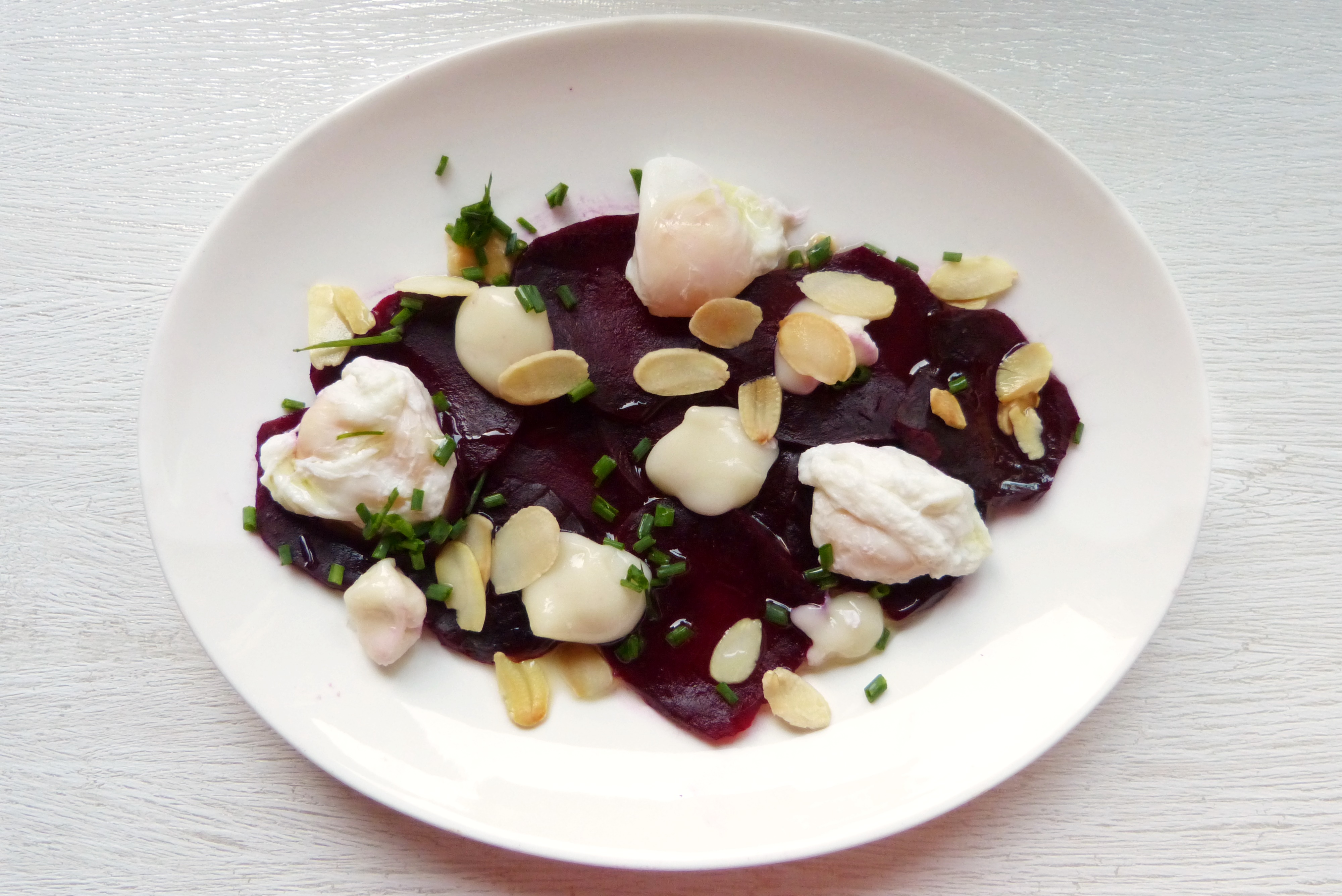 Diese schöne Vorspeise ist dem Umstand geschuldet, dass Rote Bete in der Abo-Kiste waren. Ausserdem hatte ich tatsächlich noch nie Carpaccio von der Roten Bete gemacht und ich liebe Ziegenkäse und Wachteleier.
