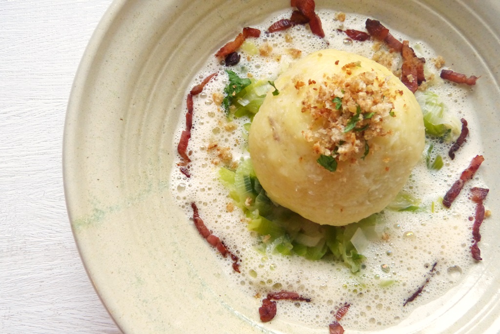 Zum Anrichten jeweils etwas Lauch in einen tiefen Teller geben. Je einen Knödel auf den Lauch setzen und mit Bröseln bestreuen. Etwas Sauce um den Lauch verteilen und die Speckstreifen darauf platzieren.
