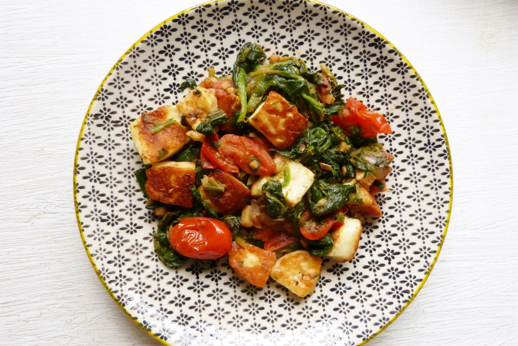 Heute gibt es die Abwandlung eines indisch-britischen Klassikers – eigentlich ist es Saag Paneer, also Frischkäse mit Spinat. Und hier eben statt Paneer Halloumi. Das passt ganz wunderbar – der Halloumi ist schön frisch und salzig und harmoniert schön mit den Gewürzen. Die Idee stammt von John Whaite, der aus guten Gründen gerade bei mir hoch im Kurs steht.
