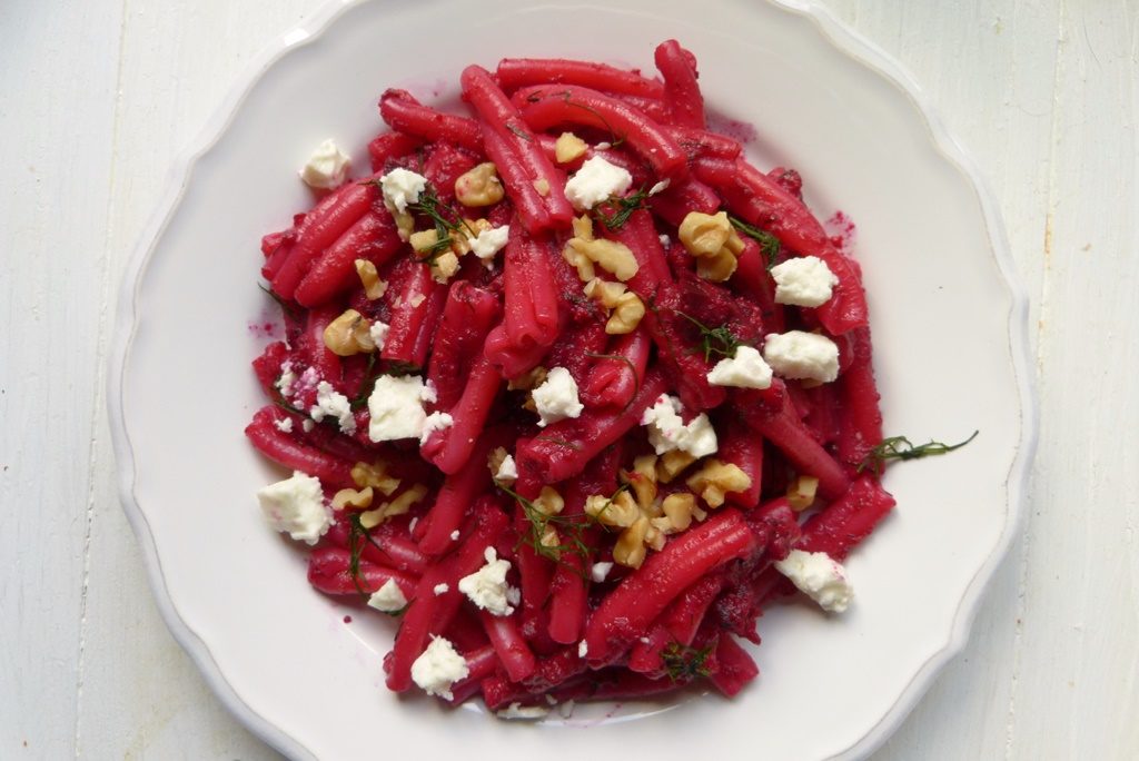 Die Rote Bete wird im Ofen geröstet – Pluspunkt, es geht nichts über ofengeröstetes Gemüse – dann mit etwas Sahne, Zitronensaft und Dill gemixt. Pasta dazu und ein Topping mit Feta und Walnüssen. Gewonnen, so mögen alle Rote Bete. Ihr bestimmt auch.