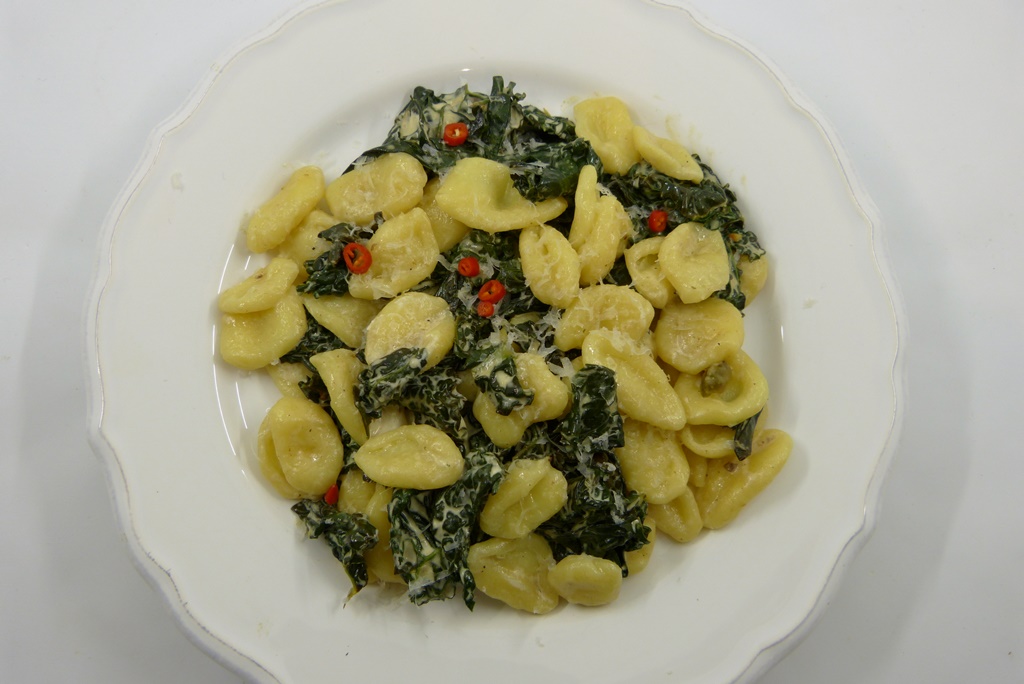 Wer nicht die Muße hat, die Pasta selbst machen, kann natürlich auf Kaufware zurückgreifen. Statt Orecchiette kann ich mir auch andere Pasta vorstellen, es sollte aber eine kurze Form sein.