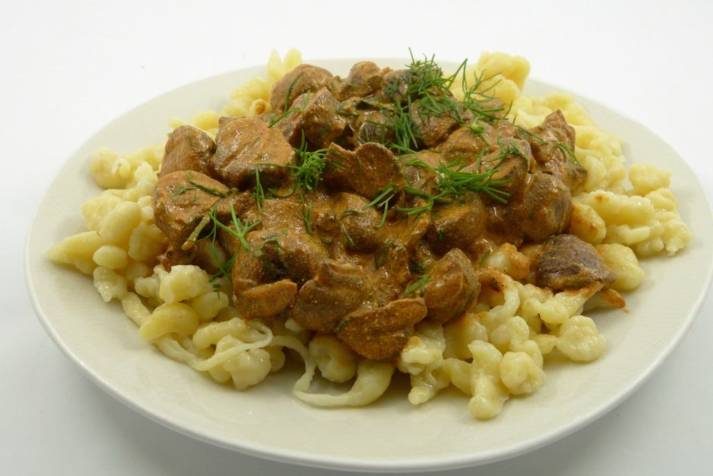 Zum Ragout habe ich Spätzle serviert – man könnte sie auch Nokedli nennen, so heißen sie auf ungarisch. wenn ich den Unterschied richtig verstanden habe, dann ist man bei Spätzle etwas großzügiger mit den Eiern. Ich verwende außerdem gerne noch etwas Grieß im Teig, die Spätzle bekommen dann einen schönen Biss.