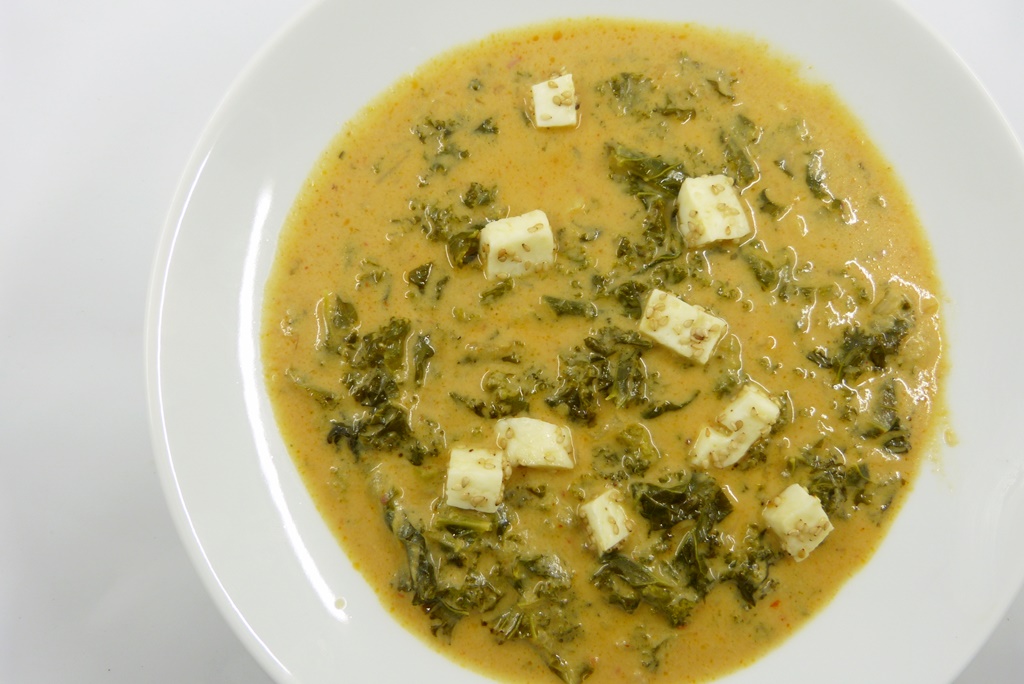 Einen EL Öl in einem Topf erhitzen und Schalotten und Knoblauch darin goldbraun anbraten. Currypaste zugeben und kurz mitrösten, dann Gemüsebrühe und Kokosmilch angießen. Erdnusscreme und Sojasauce einrühren, Kartoffelwürfel und Grünkohl zugeben, alles zum Kochen bringen und 15 bis 20 min köcheln, lassen, bis das Gemüse weich ist.