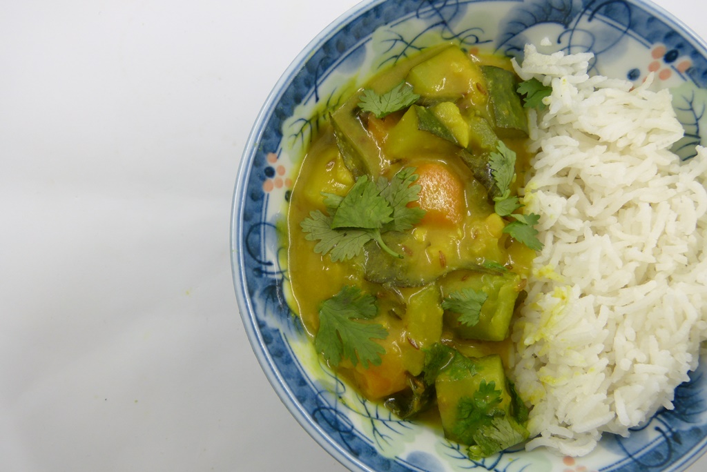 Das Originalrezept von Katharina Seiser* verwendet Bohnen statt Zucchini; ich habe halt genommen, was da war. In Indien und Pakistan gart man auch gerne Okraschoten mit.