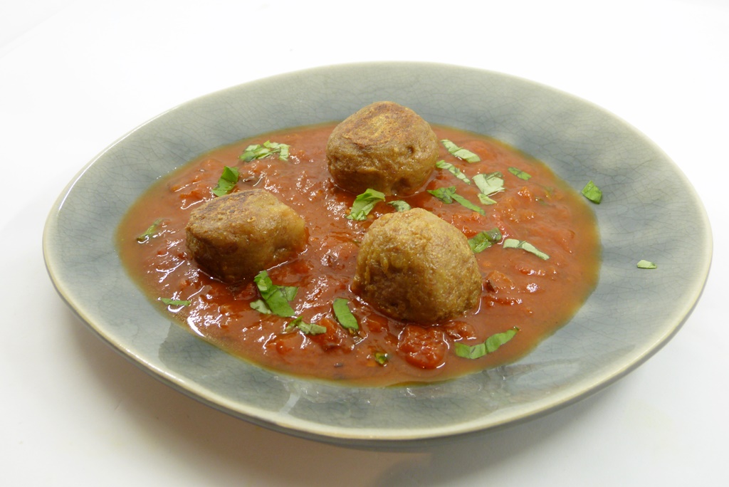 Bällchen auf der Tomatensauce anrichten und mit Basilikum bestreut servieren.