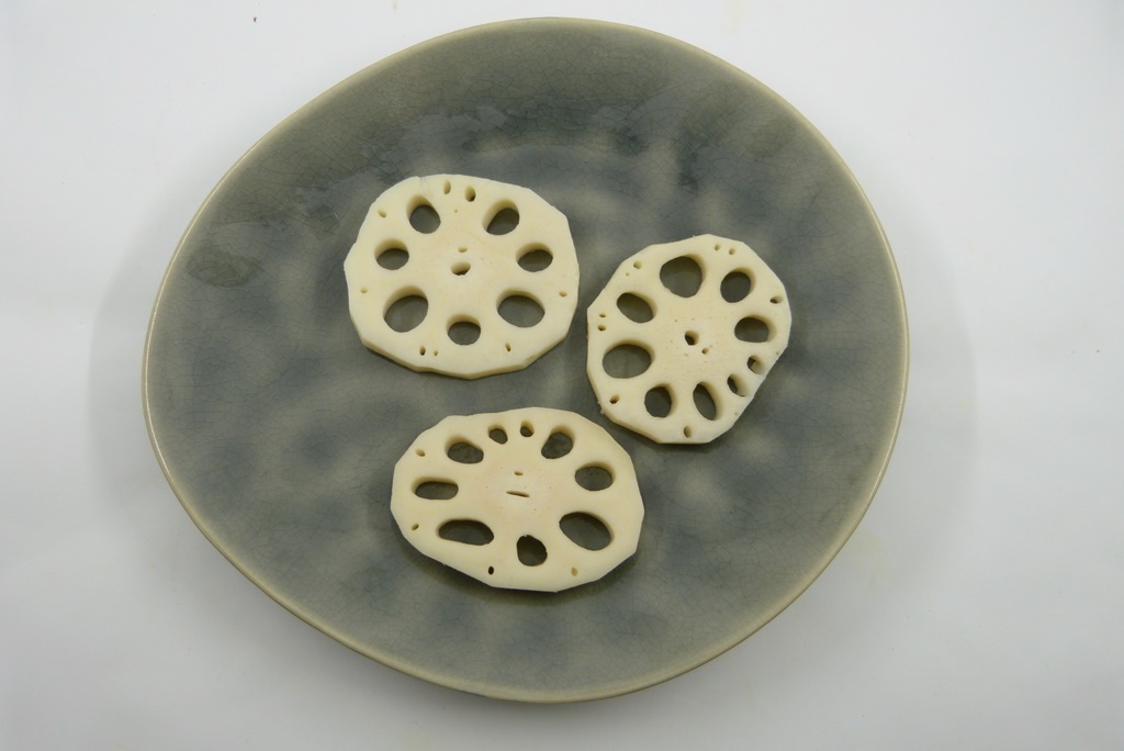 Ich nehme ja gerne beim Einkaufen Dinge mit, von denen ich erst mal nicht weiß, was ich damit machen möchte. Vor einiger Zeit war ich im Asia-Shop, und da gab es frische Lotuswurzeln. Die musste ich haben. Weil sie doch so hübsch sind, wenn man sie aufschneidet.