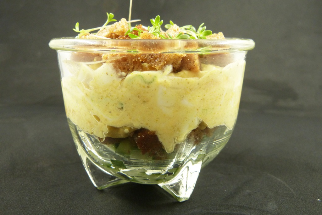 Zum Fertigstellen zunächst eine Schicht Gurkenwürfel in ein Glas geben. Darauf eine Schicht Brotwürfel geben, dann pro Glas die Hälfte des Eiersalats. Mit einer weiteren Schicht Brotwürfel abschließen und zum Servieren mit etwas Kresse bestreuen.
