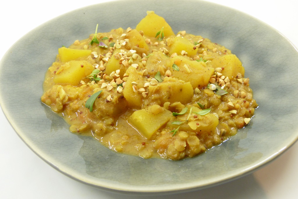 Kartoffeln, Linsen, Kokosmilch, das sind Zutaten die ich immer im Haus habe. Dann noch ein kleiner Griff in die Gewürzkiste und eine halbe Stunde später steht ein Essen auf dem Tisch, das nicht nur den Magen füllt, sondern auch sonst richtig gut tut. Eine Kleinigkeit habe ich geändert, und zwar habe ich weniger Brühe genommen, das Ganze wäre mir sonst zu suppig geworden.
