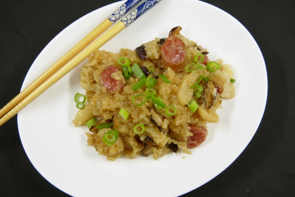 Passiert ist, dass das Ganze richtig toll schmeckt. Eigentlich ist das ein Eintopf; und noch dazu einer, der richtig schnell geht. Der Reis wird mit Shiitake, Wasserkastanien und chinesischer Wurst im Schnellkochtopf gegart. Er muss noch nicht mal eingeweicht werden und die Kombination aus klebrigem Reis, knackigen Wasserkastanien und fettiger, leicht süßer chinesischer Wurst ist toll.