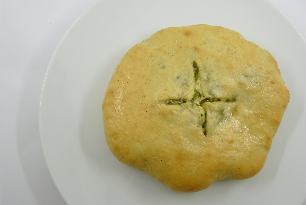 Es gibt gefüllte Teigfladen. Das Rezept kommt ursprünglich aus Ossetien. Die Osseten sind eine ganz eigene Volksgruppe im Kaukasus, sie gehen auf ein persisches Reitervolk zurück. Politisch ist ihre Lage schwierig – der Süden der Region Ossetien wurde Georgien zugeschlagen, der Norden ist russisch. Im Süden stimmte man in einem Referendum für die Unabhängigkeit, aber Georgien läßt die Osseten nicht gehen.