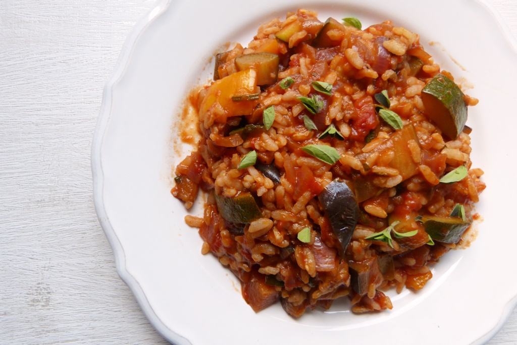 Also gut, im Lande werde ich die Lebenskünstler dieses Jahr wohl nicht bewundern können, dann kann koche ich mich halt nach Kroatien. Es gibt Djuvec-Reis. Den kennt Ihr bestimmt alle, oder? In vielen kroatischen Restaurants gibt es gerne etwas roten Reis als Standard-Beilage – dabei kann Djuvec viel mehr. Das Gericht kommt eigentlich aus der Türkei, wo es nach dem zum Garen verwendeten Tontopf Güvec heißt. In Kroatien wird es gerne zu gegrilltem Fleisch serviert, man kann es aber auch als Hauptgericht essen; das haben wir gemacht. Manchmal gibt man auch Fleisch zur Gemüsemischung. Und im Sommer kocht man gerne die Gemüsemischung ohne Reis ein – so kann man auch im Winter auf Djuvec zurückgreifen.
