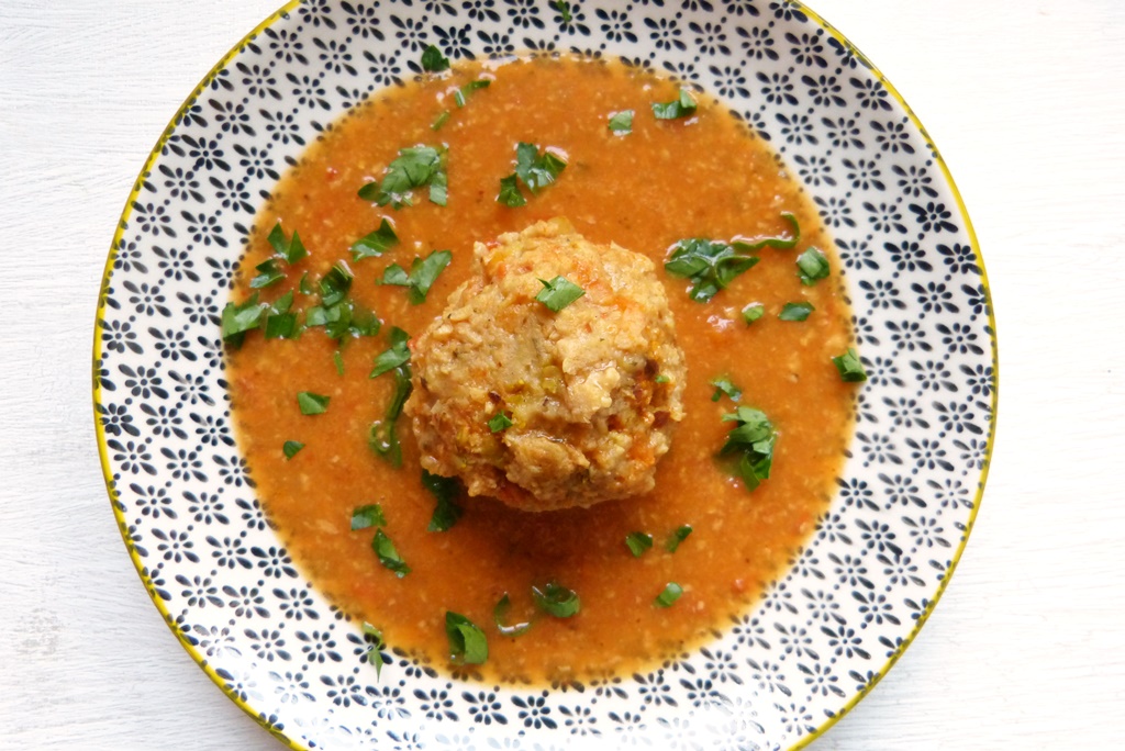 Das sind nicht einfach Bällchen, sie sind gefüllt mir einer Mischung aus Trockenfrüchten und Nüssen und schwimmen in einer tollen Sauce. Sally Butcher erzählt, dass die Originalversion mit Fleisch aus der Stadt Täbris im Norden des Irans stammt. Die Stadt ist berühmt für ihren Käse – und für die Größe ihrer Fleischbällchen. Und stimmt, die Bällchen sind groß, und das, obwohl ich die kleinere Form gewählt habe.
