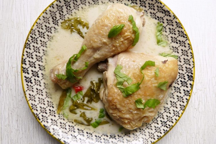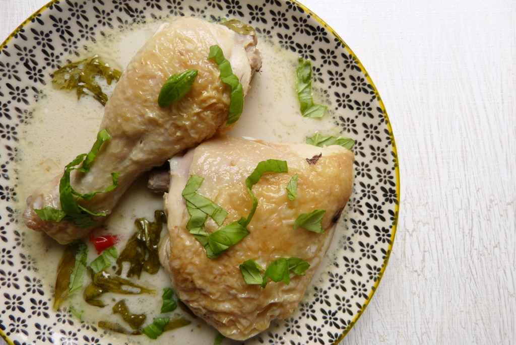 Das ist eine Variante des klassischen, in Milch gegarten Hühnchens (die ich auch mal ausprobieren muss). Die Kokosbrühe ist schön aromatisch – dafür sorgen Ingwer, Knoblauch, ein wenig Chili, Limettensaft und eben eine großzügige Menge Basilikum. Verwendet werden zwei Dosen Kokosmilch – es gibt also sehr viel Brühe, es wird etwas übrig bleiben. Das ist aber kein Schaden – die restliche Brühe eignet sich hervorragend als Grundlage für eine Sauce oder Suppe. Wir hatten auch noch etwas Fleisch übrig, das habe ich zerzupft und am nächsten Tag zusammen mit etwas Reis in der Brühe als Suppe serviert.