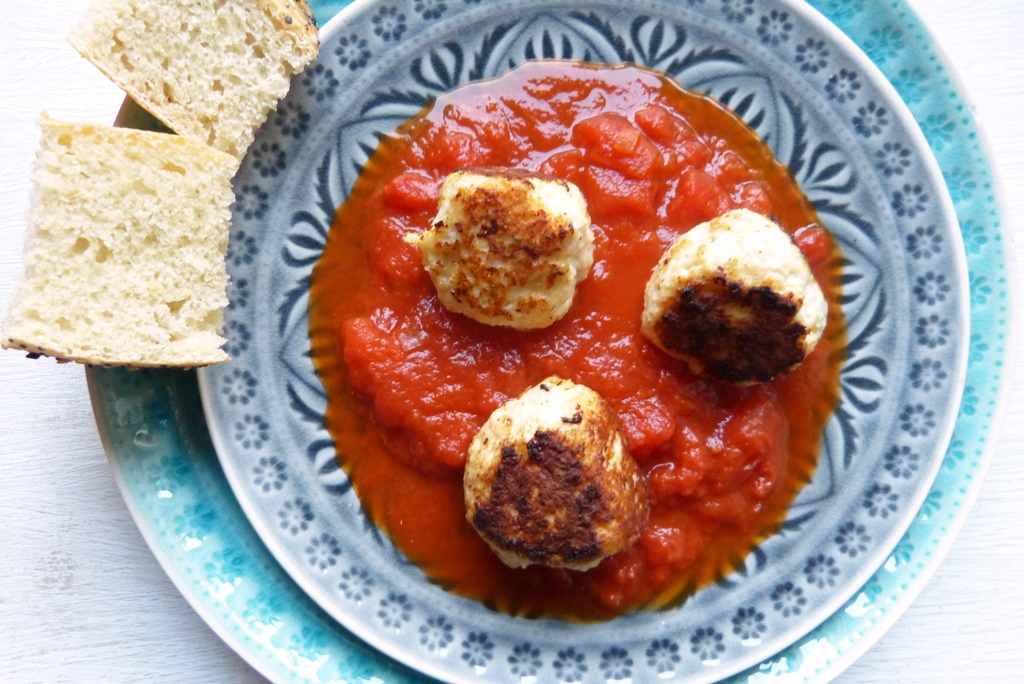 Das Rezept verdanke ich Emiko Davies. Es ist eine Version von Polpette, aber eben mit Hühnchen und Ricotta – und wirklich toll. Der Ricotta macht die Bällchen besonders fluffig und leicht. Außerdem sind sie ein schönes Familienessen – die Zutaten sind so einfach, dass kaum jemand etwas zu meckern findet. Wer es etwas würziger mag, kann noch ein wenig gehackte Petersilie an die Bälllchenmasse geben oder die Sauce mit Knoblauch und / oder Chili aufpeppen, aber uns haben die klaren, einfachen Aromen gut gefallen.
