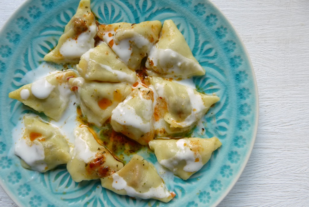 Am liebsten mag ich aber diese Nudelteigtäschchen hier – manchmal werden sie auch türkische Ravioli genannt. Dies hier ist die klassische Version mit Hackfleischfüllung und zwei Saucen, man kann sie aber auch vegetarisch füllen, zum Beispiel mit Kartoffeln. Eine vegetarische Variante mit Kichererbsen habe ich Euch bereits vorgestellt.