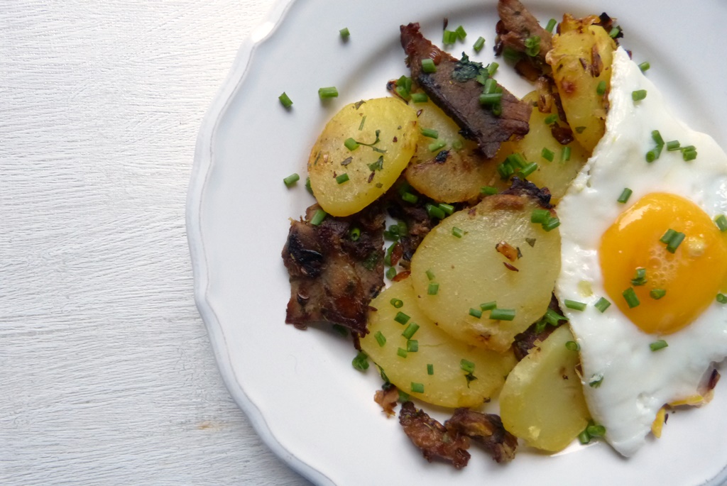 Geröstel ist für mich eine schöne Erinnerung – da gab es früher immer mit den Resten vom Sonntagsbraten und den restlichen Knödeln und dann kam Rührei darüber – es war lieber als der Braten. Hier besteht das Tiroler Gröstl aus gegartem Rindfleisch und gekochten Kartoffeln. Alles wird angebraten, im Ofen fertig gegart und mit einem Spiegelei serviert.